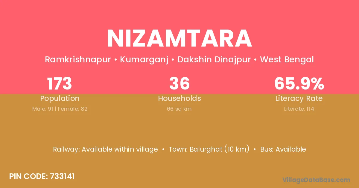 Balurghat (10 km) is the nearest town to Nizamtara village for major economic activities and is located approximately 10 km away.
