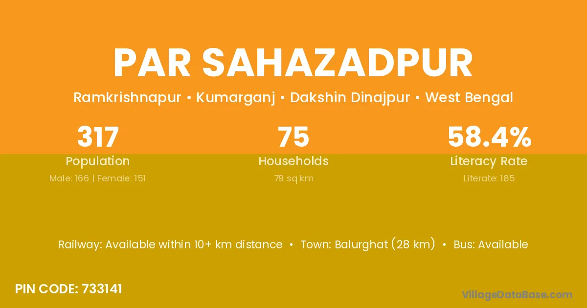 Balurghat (28 km) is the nearest town to Par Sahazadpur village for major economic activities and is located approximately 28 km away.