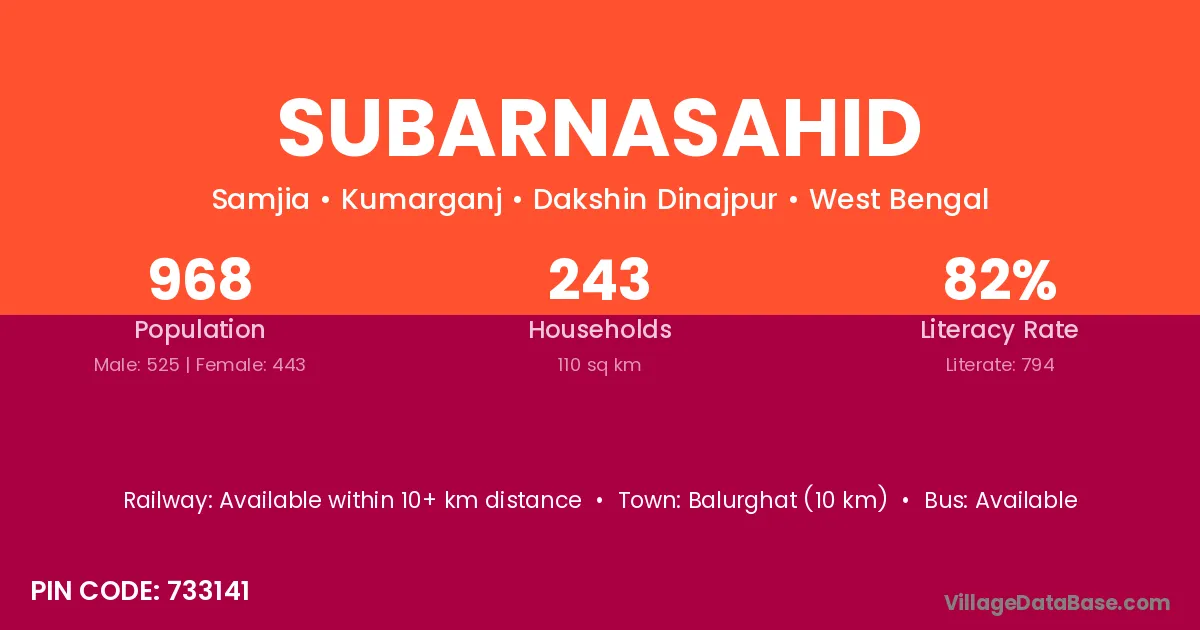 Balurghat (10 km) is the nearest town to Subarnasahid village for major economic activities and is located approximately 10 km away.