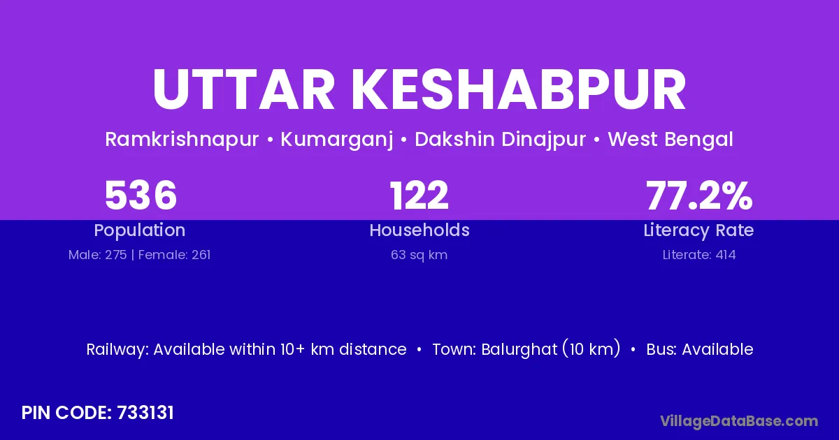 Balurghat (10 km) is the nearest town to Uttar Keshabpur village for major economic activities and is located approximately 10 km away.