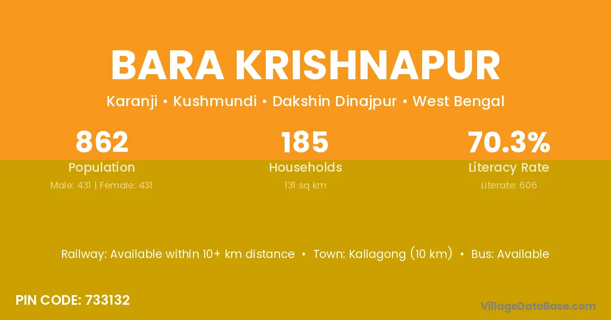 Bara Krishnapur village has a total population of 862 people, of which 431 are males and 431 are females.