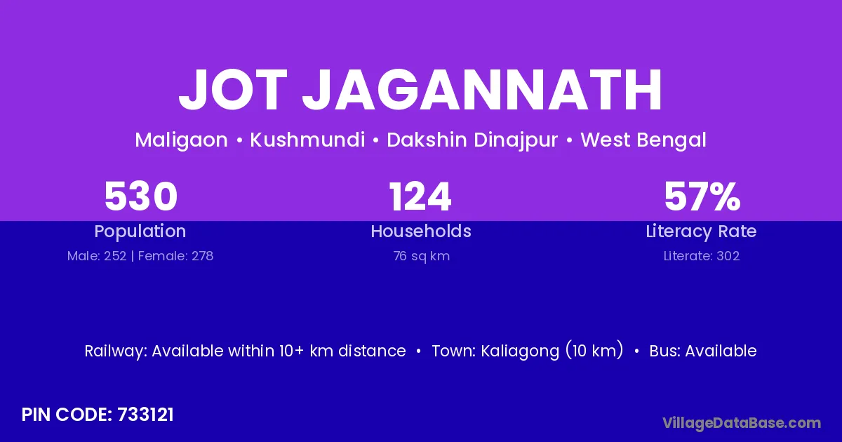 Kaliagong (10 km) is the nearest town to Jot Jagannath village for major economic activities and is located approximately 10 km away.