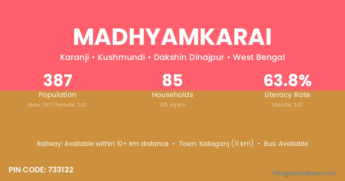Kaliaganj (11 km) is the nearest town to Madhyamkarai village for major economic activities and is located approximately 11 km away.