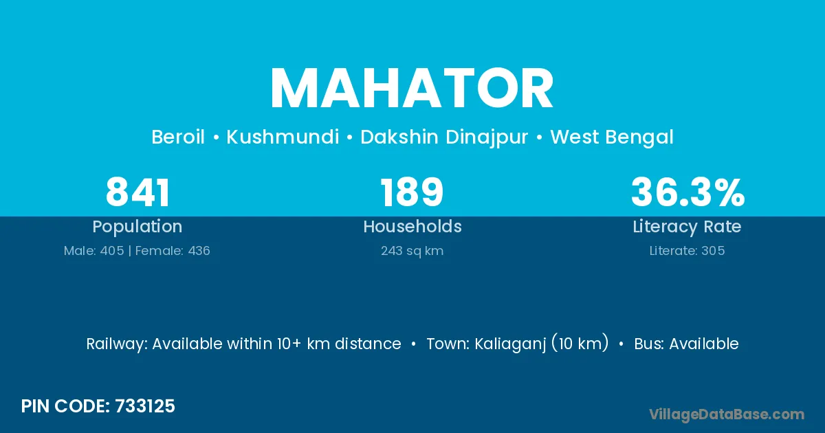 Kaliaganj (10 km) is the nearest town to Mahator village for major economic activities and is located approximately 10 km away.