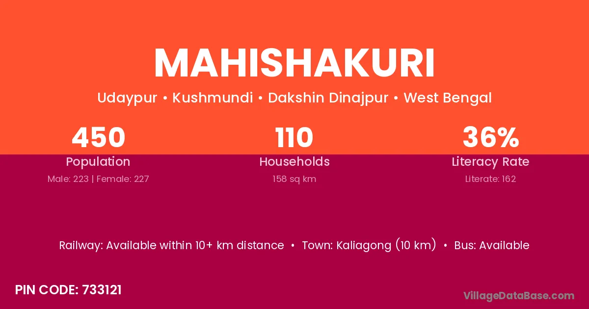 Mahishakuri village has a total population of 450 people, of which 223 are males and 227 are females.