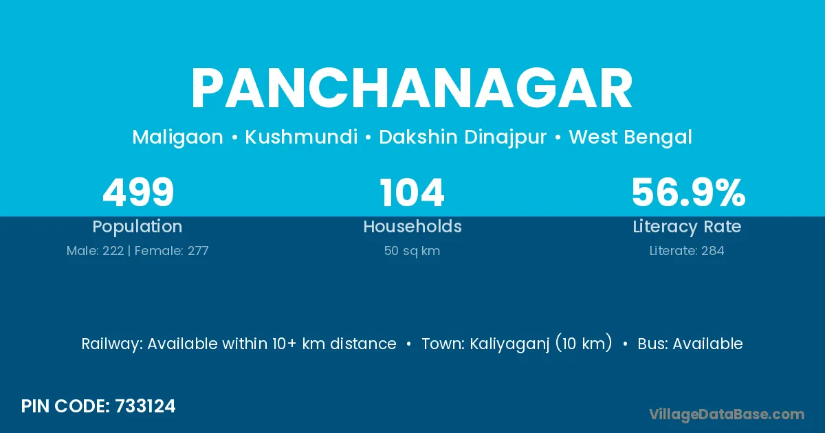 Kaliyaganj (10 km) is the nearest town to Panchanagar village for major economic activities and is located approximately 10 km away.