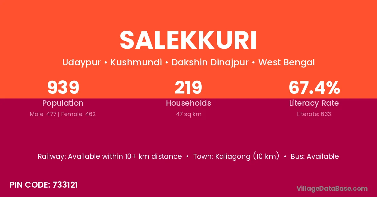 Kaliagong (10 km) is the nearest town to Salekkuri village for major economic activities and is located approximately 10 km away.