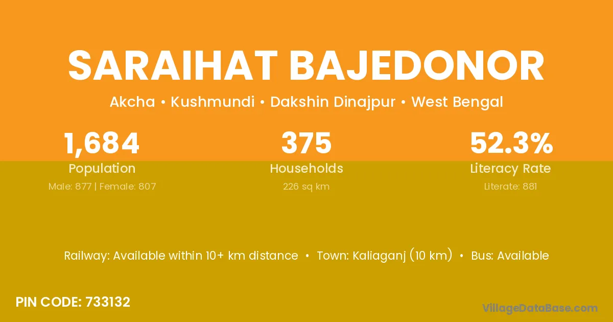 Kaliaganj (10 km) is the nearest town to Saraihat Bajedonor village for major economic activities and is located approximately 10 km away.