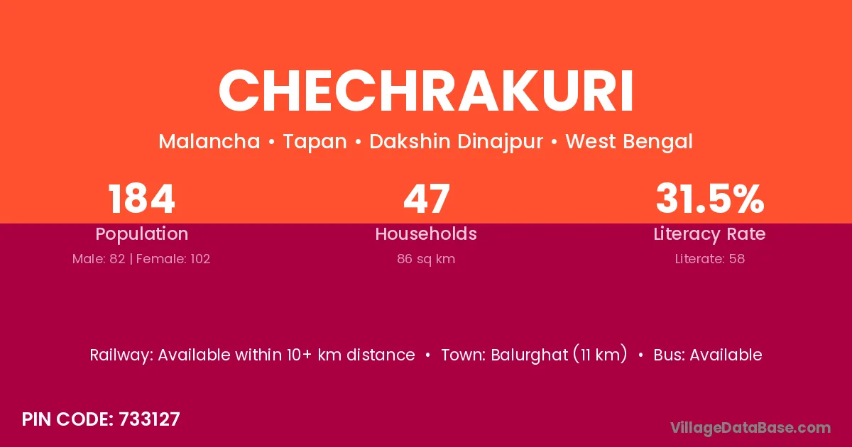 Balurghat (11 km) is the nearest town to Chechrakuri village for major economic activities and is located approximately 11 km away.