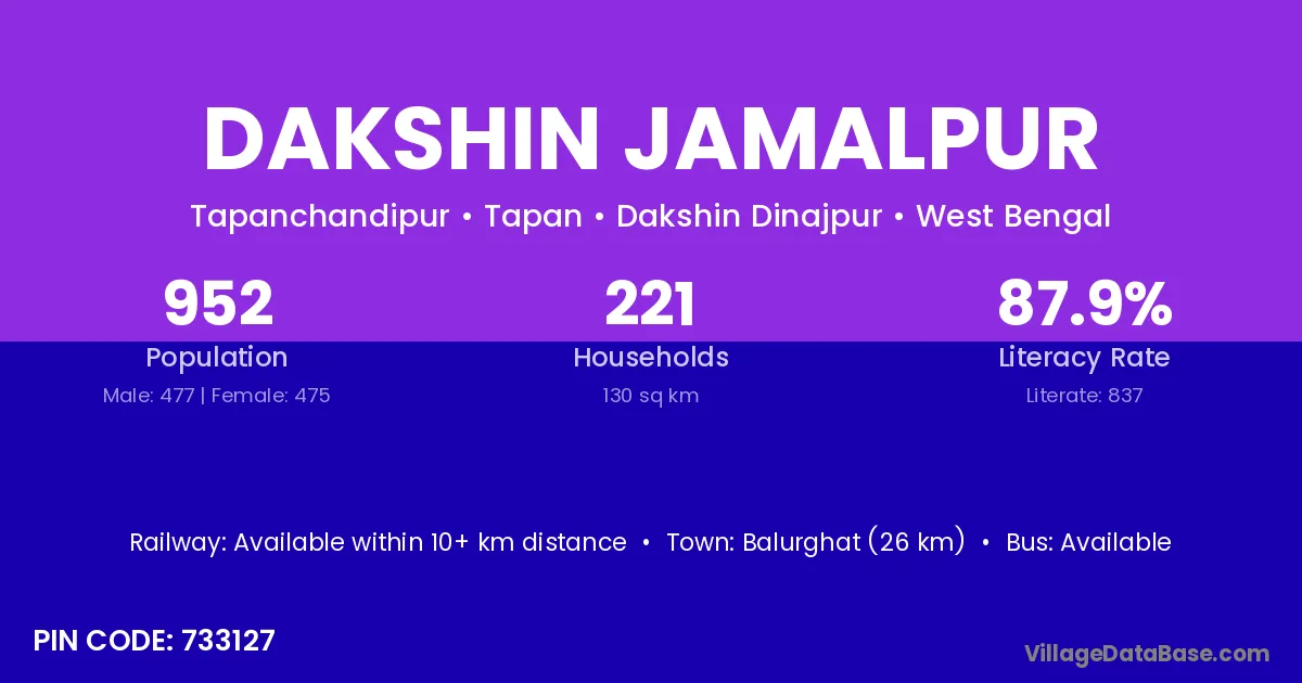 Dakshin Jamalpur village has a total population of 952 people, of which 477 are males and 475 are females.
