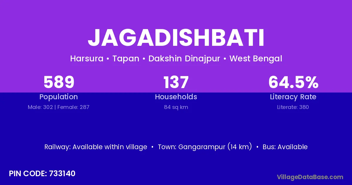 Gangarampur (14 km) is the nearest town to Jagadishbati village for major economic activities and is located approximately 14 km away.