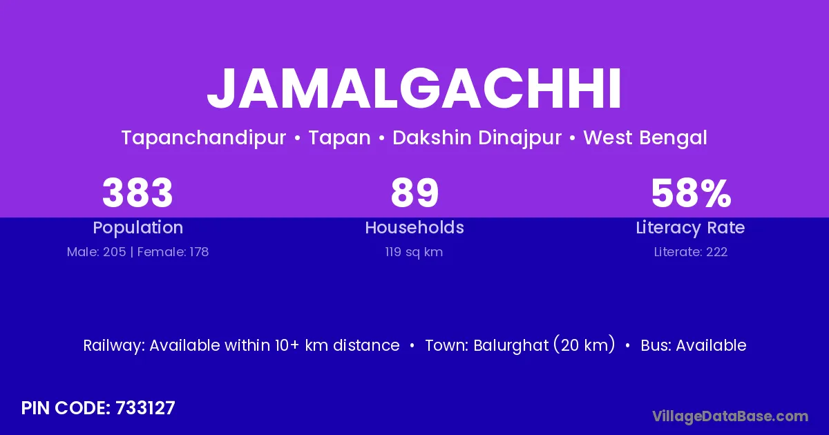 Balurghat (20 km) is the nearest town to Jamalgachhi village for major economic activities and is located approximately 20 km away.