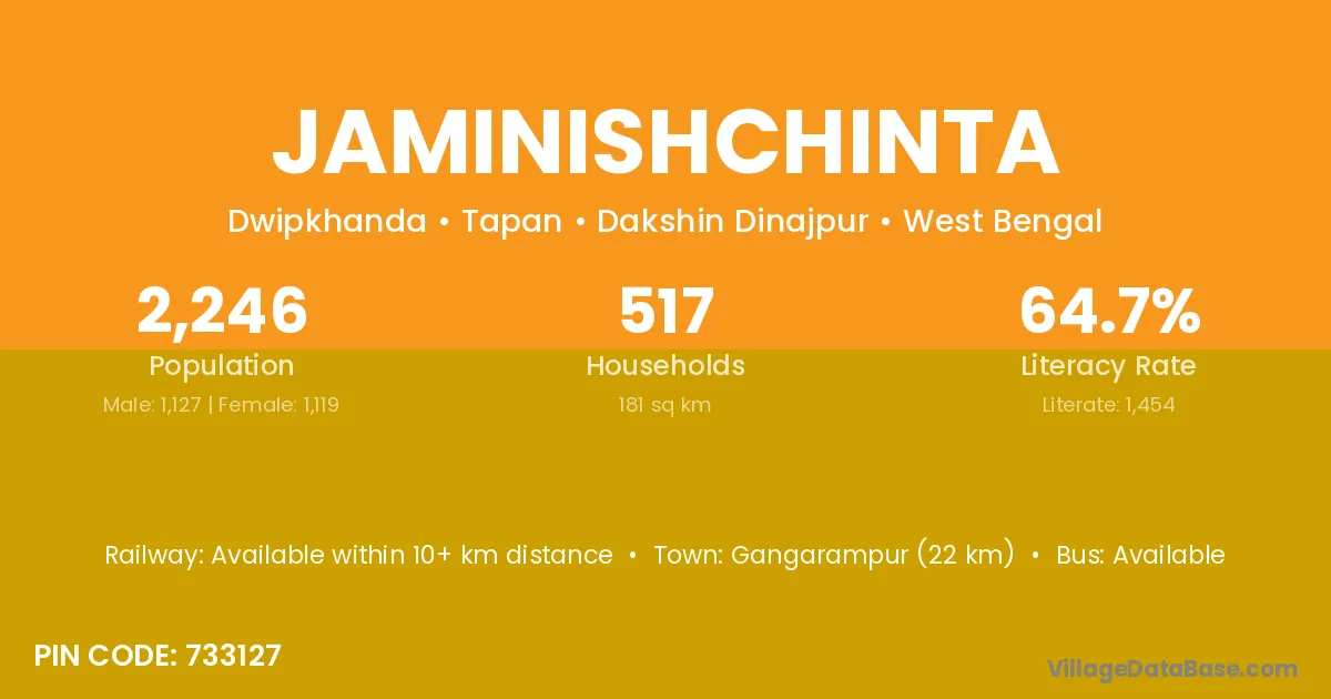 Gangarampur (22 km) is the nearest town to Jaminishchinta village for major economic activities and is located approximately 22 km away.