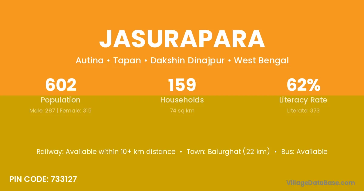 Balurghat (22 km) is the nearest town to Jasurapara village for major economic activities and is located approximately 22 km away.