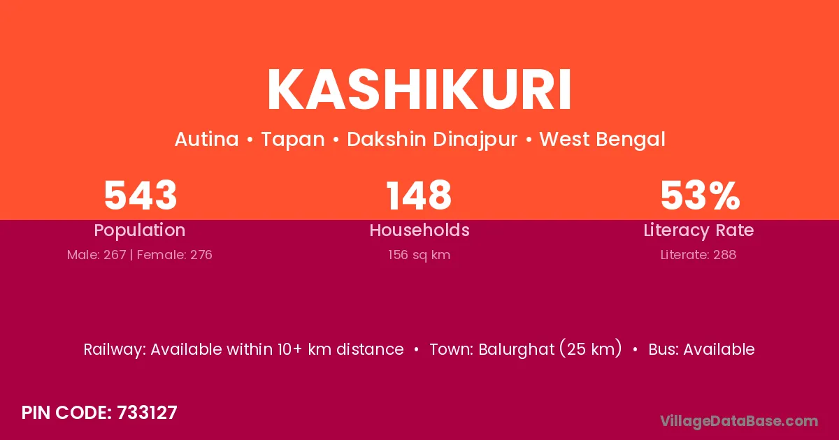 Balurghat (25 km) is the nearest town to Kashikuri village for major economic activities and is located approximately 25 km away.