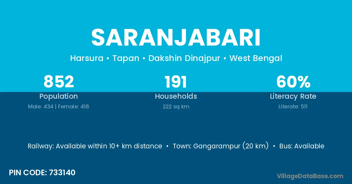 Gangarampur (20 km) is the nearest town to Saranjabari village for major economic activities and is located approximately 20 km away.