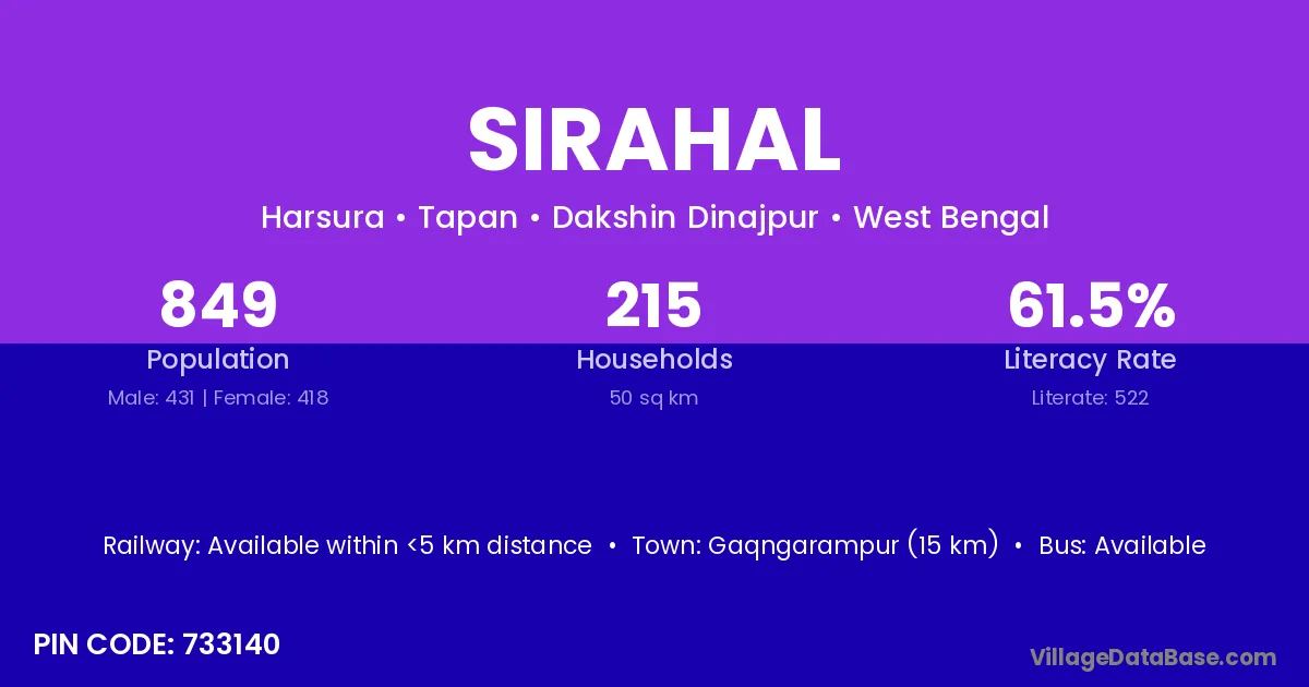 Gaqngarampur (15 km) is the nearest town to Sirahal village for major economic activities and is located approximately 15 km away.