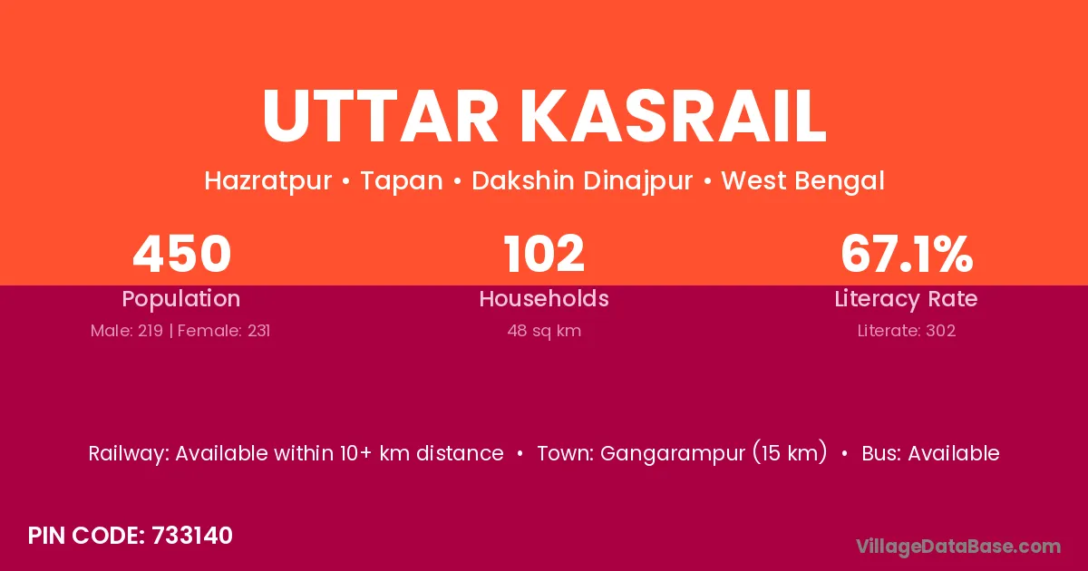 Gangarampur (15 km) is the nearest town to Uttar Kasrail village for major economic activities and is located approximately 15 km away.