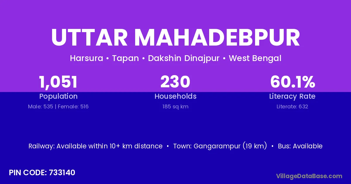 Gangarampur (19 km) is the nearest town to Uttar Mahadebpur village for major economic activities and is located approximately 19 km away.