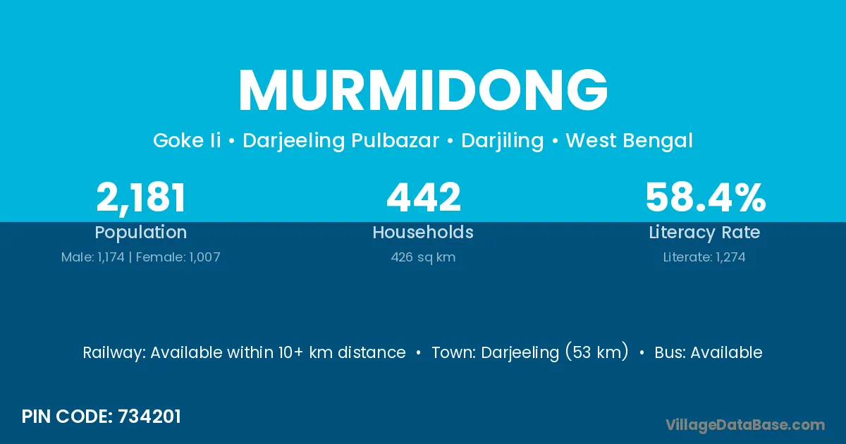 Darjeeling (53 km) is the nearest town to Murmidong village for major economic activities and is located approximately 53 km away.