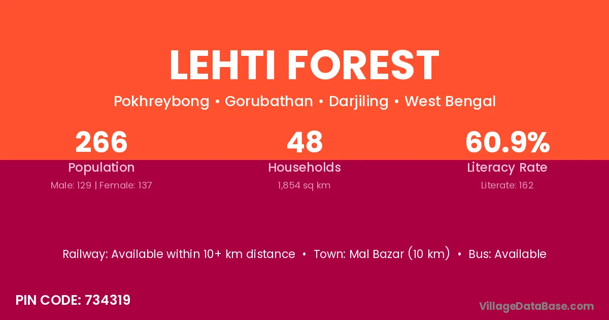 Mal Bazar (10 km) is the nearest town to Lehti Forest village for major economic activities and is located approximately 10 km away.