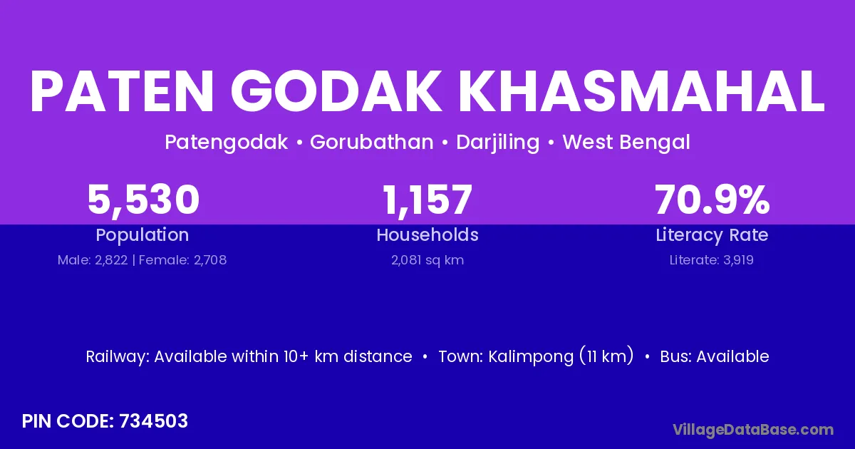 Kalimpong (11 km) is the nearest town to Paten Godak Khasmahal village for major economic activities and is located approximately 11 km away.