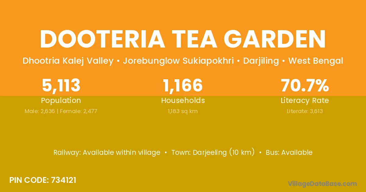 Darjeeling (10 km) is the nearest town to Dooteria Tea Garden village for major economic activities and is located approximately 10 km away.