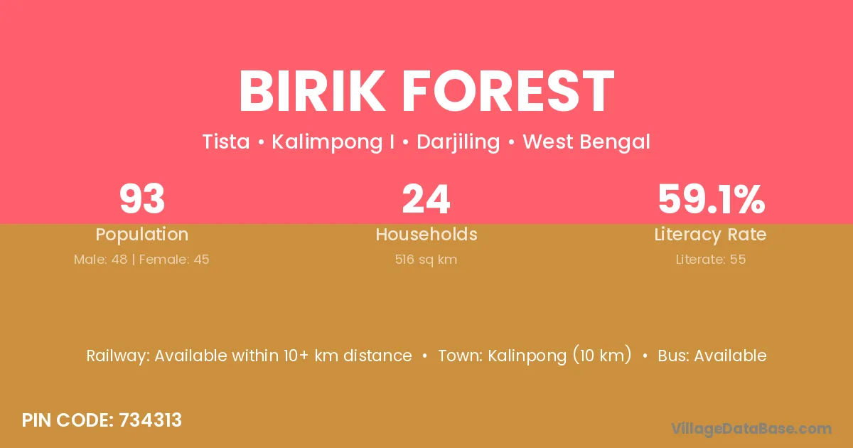 Kalinpong (10 km) is the nearest town to Birik Forest village for major economic activities and is located approximately 10 km away.