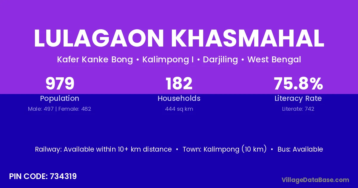 Kalimpong (10 km) is the nearest town to Lulagaon Khasmahal village for major economic activities and is located approximately 10 km away.