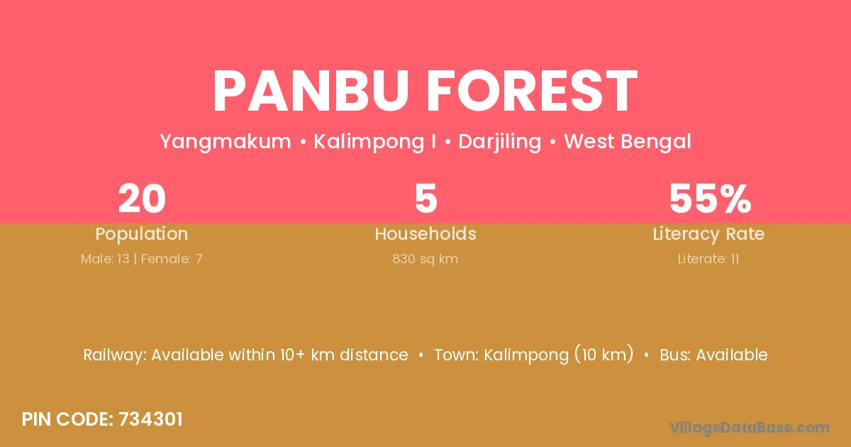 Panbu Forest village has a total population of 20 people, of which 13 are males and 7 are females.