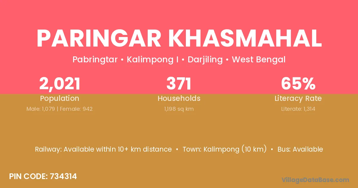 Kalimpong (10 km) is the nearest town to Paringar Khasmahal village for major economic activities and is located approximately 10 km away.