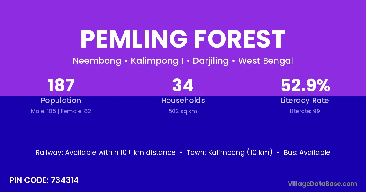Kalimpong (10 km) is the nearest town to Pemling Forest village for major economic activities and is located approximately 10 km away.