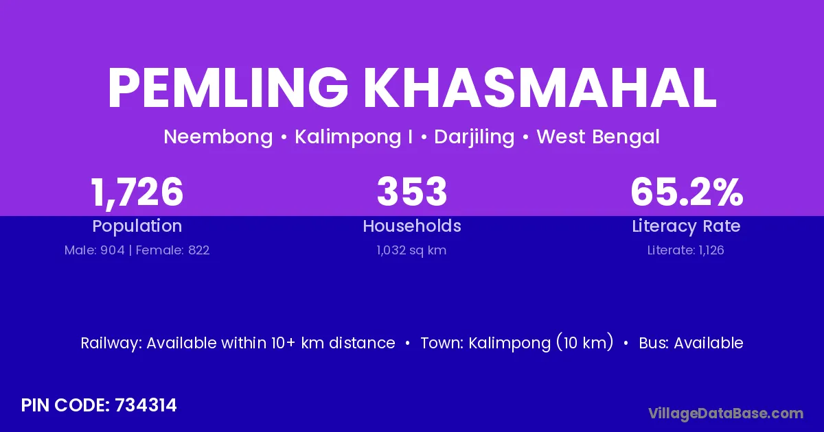 Kalimpong (10 km) is the nearest town to Pemling Khasmahal village for major economic activities and is located approximately 10 km away.