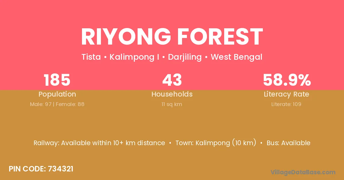 Riyong Forest village has a total population of 185 people, of which 97 are males and 88 are females.