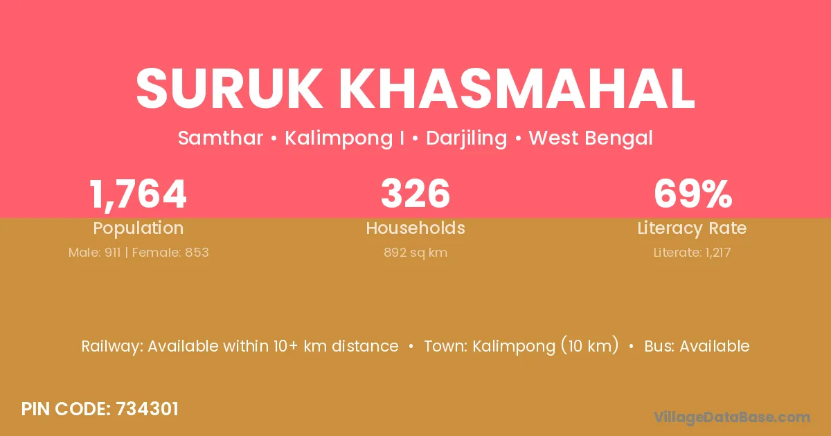 Kalimpong (10 km) is the nearest town to Suruk Khasmahal village for major economic activities and is located approximately 10 km away.