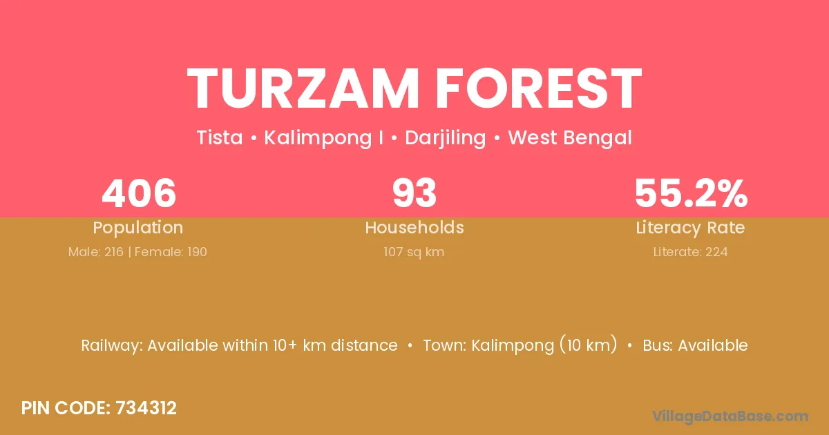 Kalimpong (10 km) is the nearest town to Turzam Forest village for major economic activities and is located approximately 10 km away.