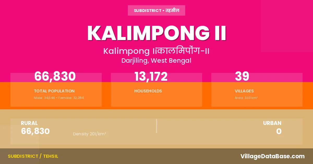 According to the 2011 census The total area of Kalimpong II Subdivision is 333 km², with a population of 66830 people. The population density is 201 inhabitants per square kilometre, and there are approximately 13172 houses in the sub district.