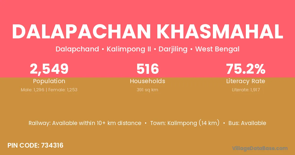 Kalimpong (14 km) is the nearest town to Dalapachan Khasmahal village for major economic activities and is located approximately 14 km away.