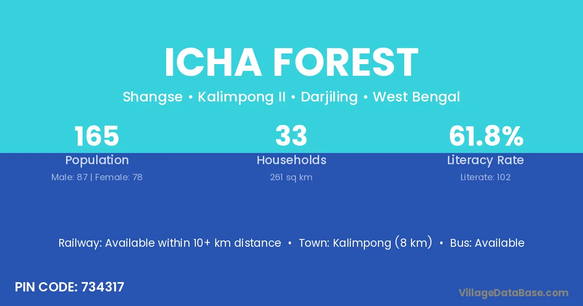 Kalimpong (8 km) is the nearest town to Icha Forest village for major economic activities and is located approximately 8 km away.