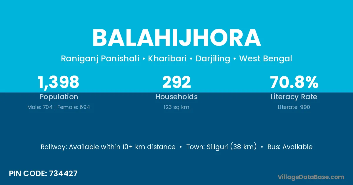 Siliguri (38 km) is the nearest town to Balahijhora village for major economic activities and is located approximately 38 km away.