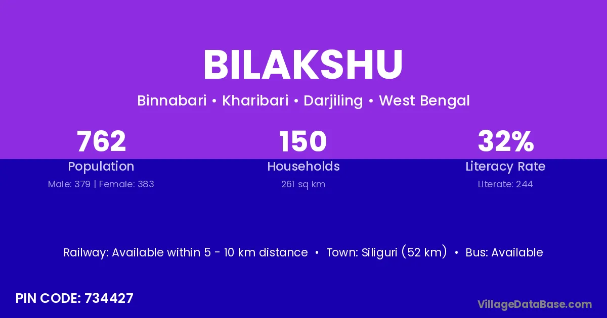 Siliguri (52 km) is the nearest town to Bilakshu village for major economic activities and is located approximately 52 km away.