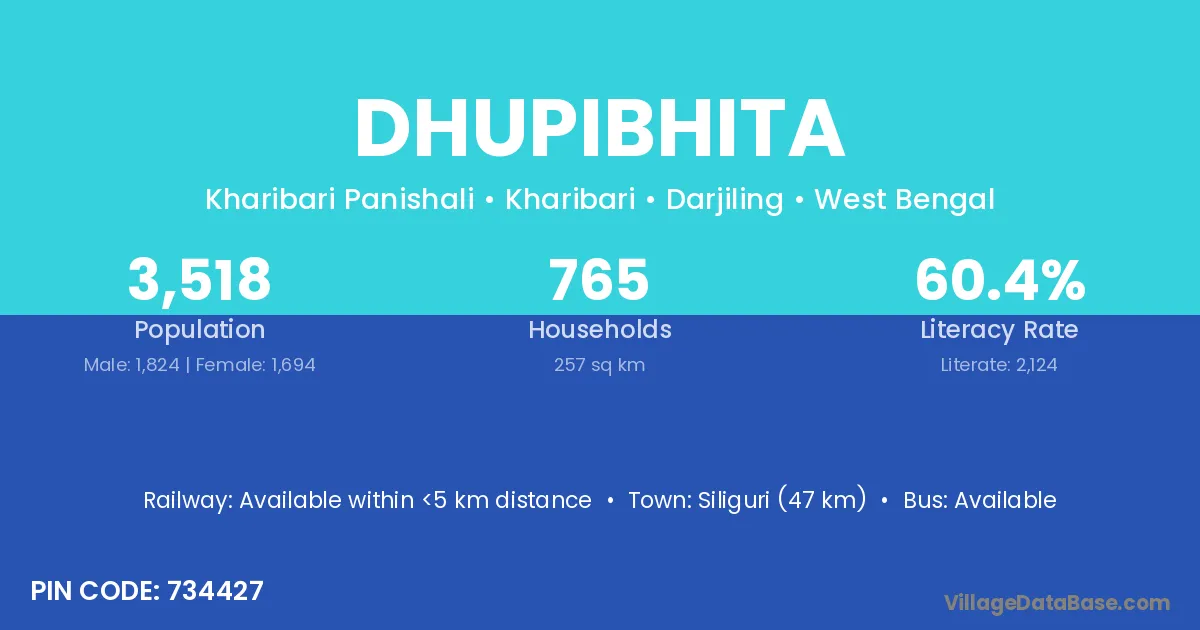 Siliguri (47 km) is the nearest town to Dhupibhita village for major economic activities and is located approximately 47 km away.