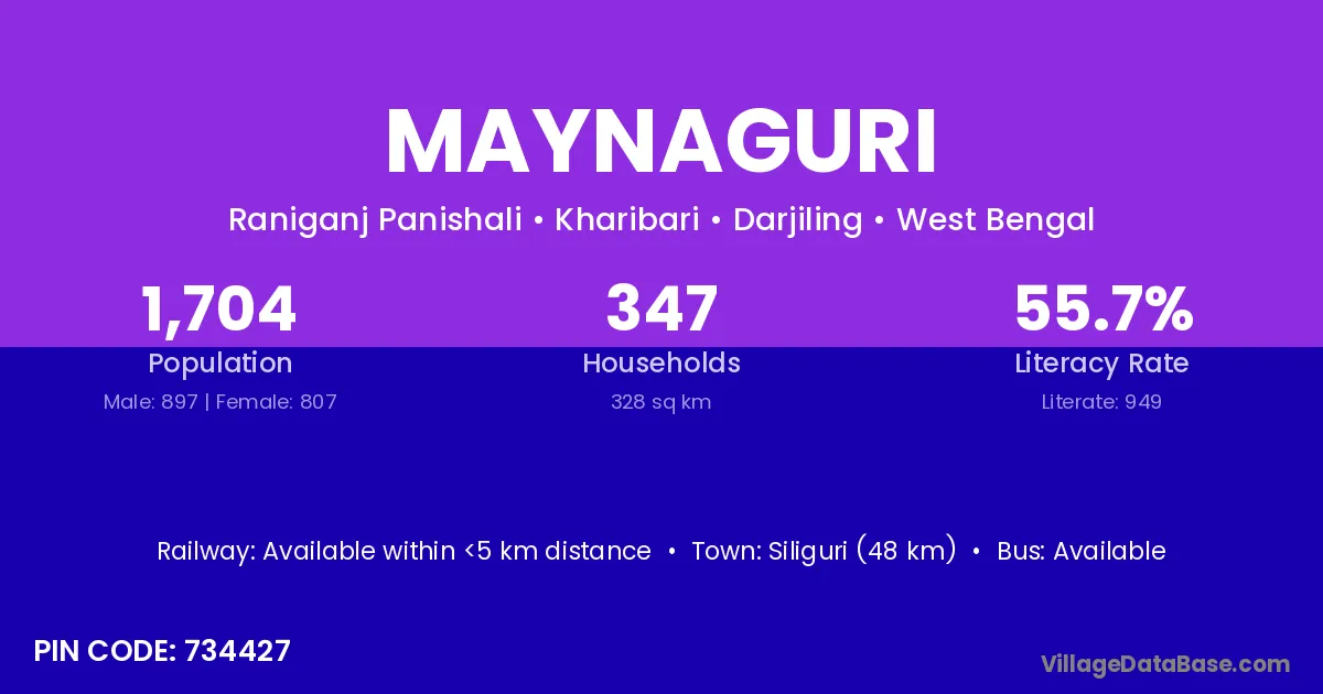 Siliguri (48 km) is the nearest town to Maynaguri village for major economic activities and is located approximately 48 km away.