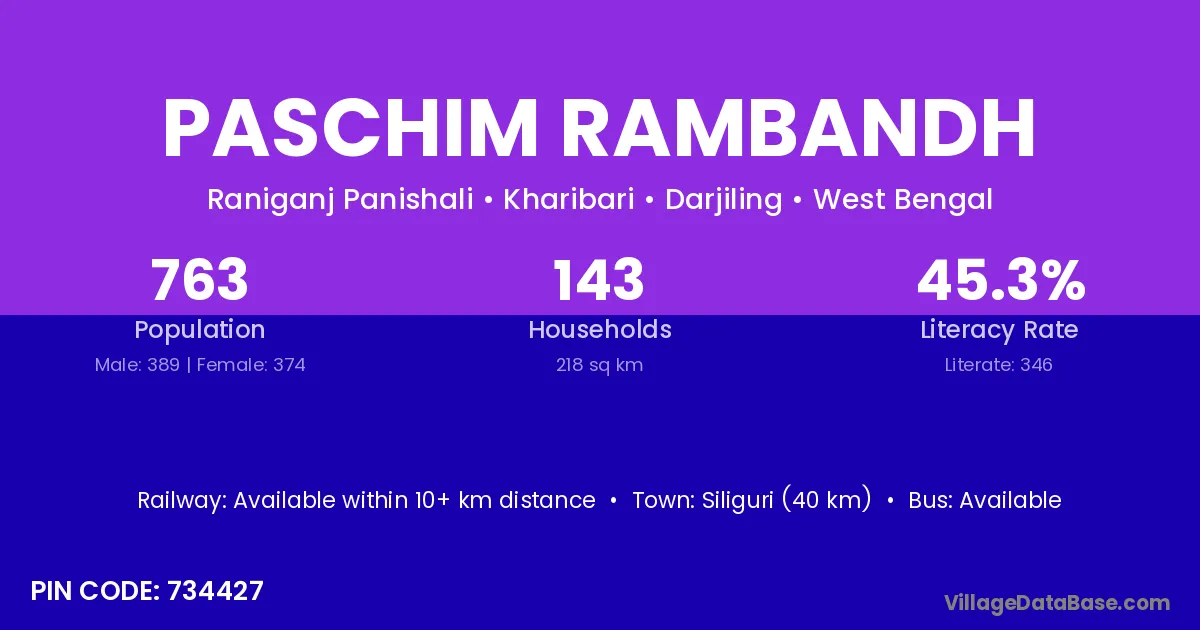 Siliguri (40 km) is the nearest town to Paschim Rambandh village for major economic activities and is located approximately 40 km away.