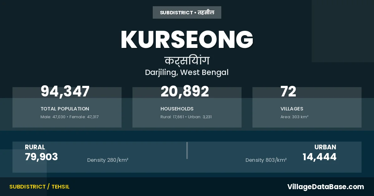 According to the 2011 census The total area of Kurseong Subdivision is 303 km², with a population of 94347 people. The population density is 311 inhabitants per square kilometre, and there are approximately 20892 houses in the sub district.