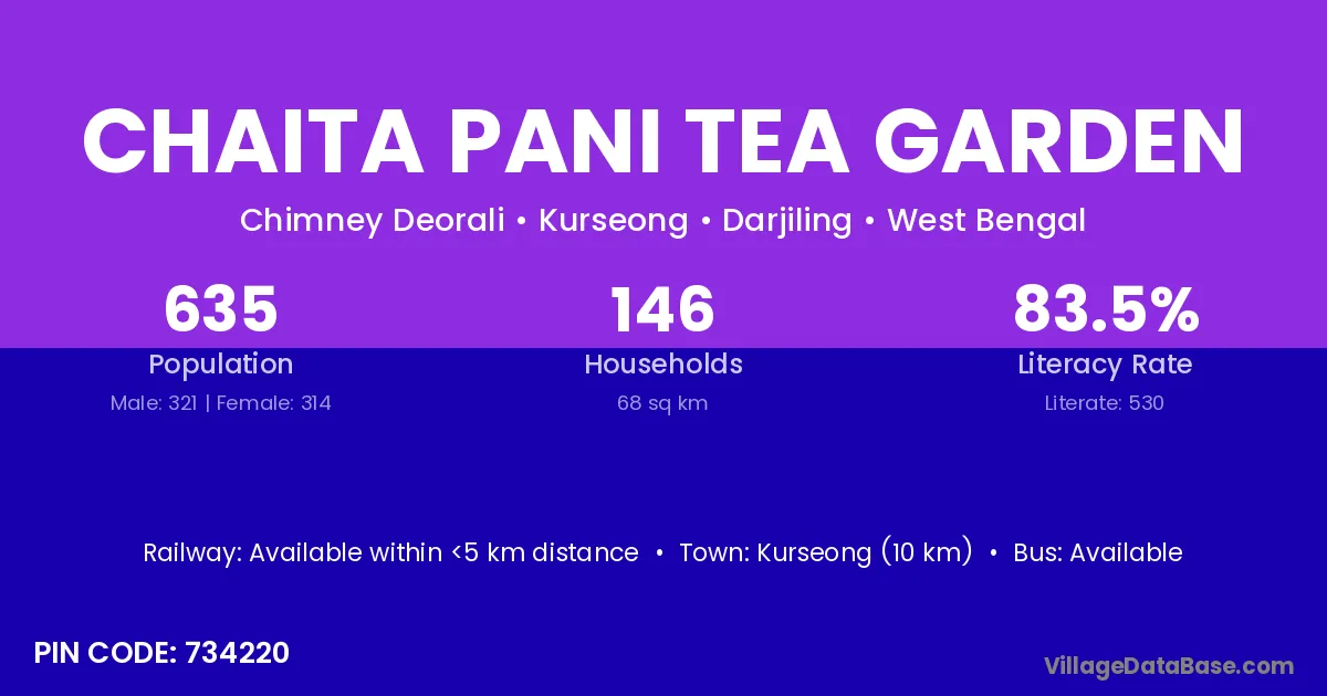 Kurseong (10 km) is the nearest town to Chaita Pani Tea Garden village for major economic activities and is located approximately 10 km away.