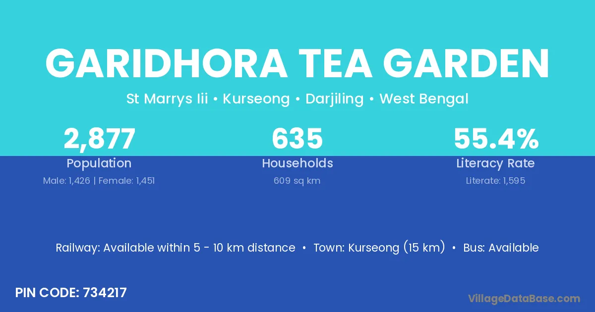 Kurseong (15 km) is the nearest town to Garidhora Tea Garden village for major economic activities and is located approximately 15 km away.