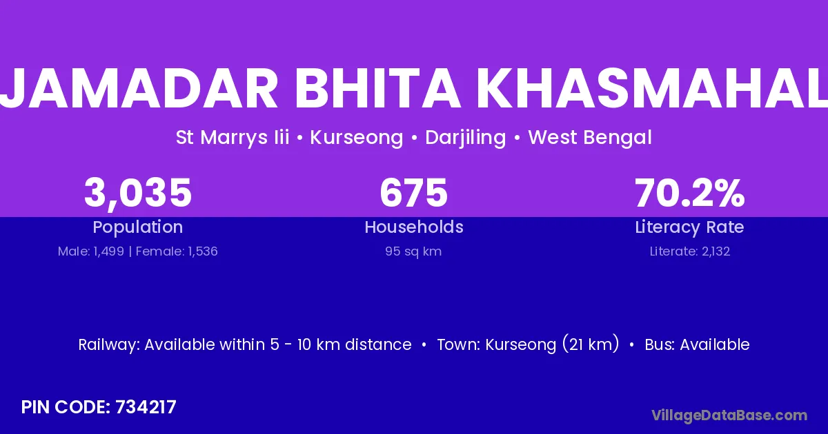 Kurseong (21 km) is the nearest town to Jamadar Bhita Khasmahal village for major economic activities and is located approximately 21 km away.
