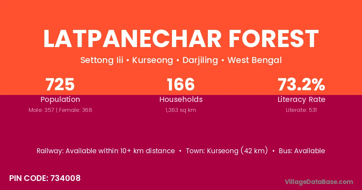 Latpanechar Forest village has a total population of 725 people, of which 357 are males and 368 are females.
