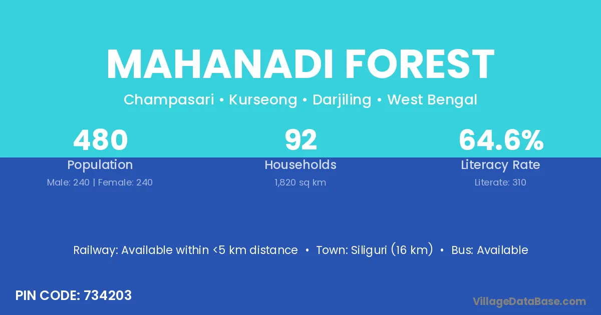 Siliguri (16 km) is the nearest town to Mahanadi Forest village for major economic activities and is located approximately 16 km away.